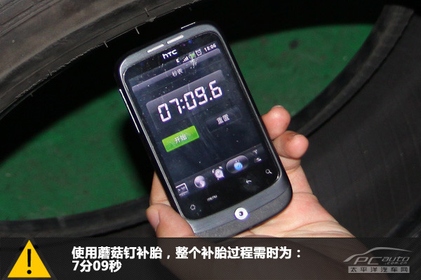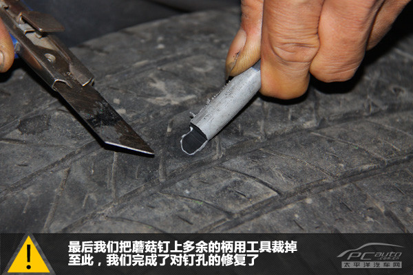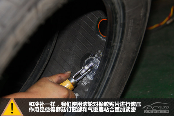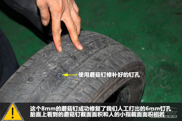 輪胎外部看到的是蘑菇釘?shù)谋慕孛?,此截面面積與人的小指的截面面積相若。整個補胎過程用時7分09秒,時間比冷補還是要長不少。