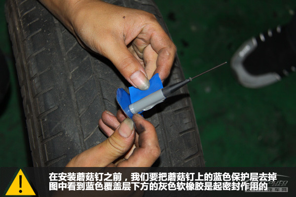 一切就緒,我們把蘑菇釘?shù)匿撫槒妮喬?nèi)部插進釘孔,穿過整個輪胎的復(fù)合橡膠層。