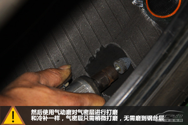 首先,要稍微打磨釘孔附近的輪胎氣密層。和冷補一樣,氣密層只需稍微打磨,無需磨到鋼絲層。