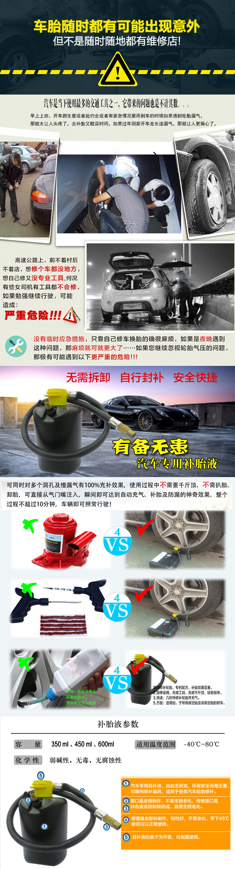 汽車輪胎自補(bǔ)液,耐腐蝕:使用后,輪圈依然完好無缺;持久防銹:使用成膜光亮成分, 令輪輞、輪胎不易粘附污漬,持久光亮;防凍效果強(qiáng)悍:國內(nèi)市場防凍超過零下45攝氏度的輪胎自補(bǔ)液。無需千斤頂、無需膠條工具,汽車專用自補(bǔ)液。